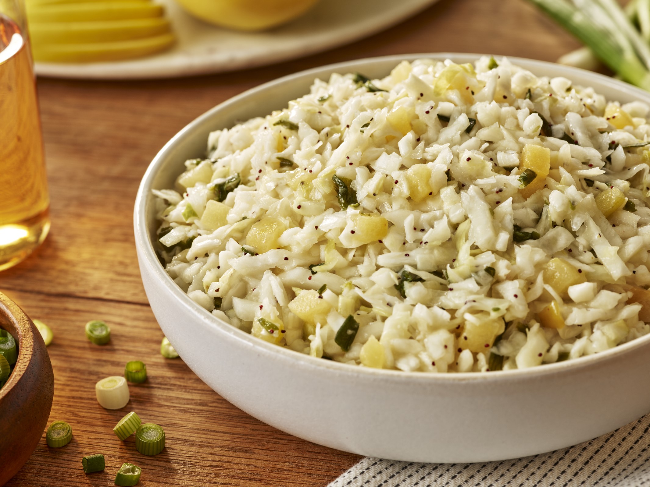 A blend of freshly shredded cabbage, green onions, and diced apples in a light and tangy oil and vinegar dressing.